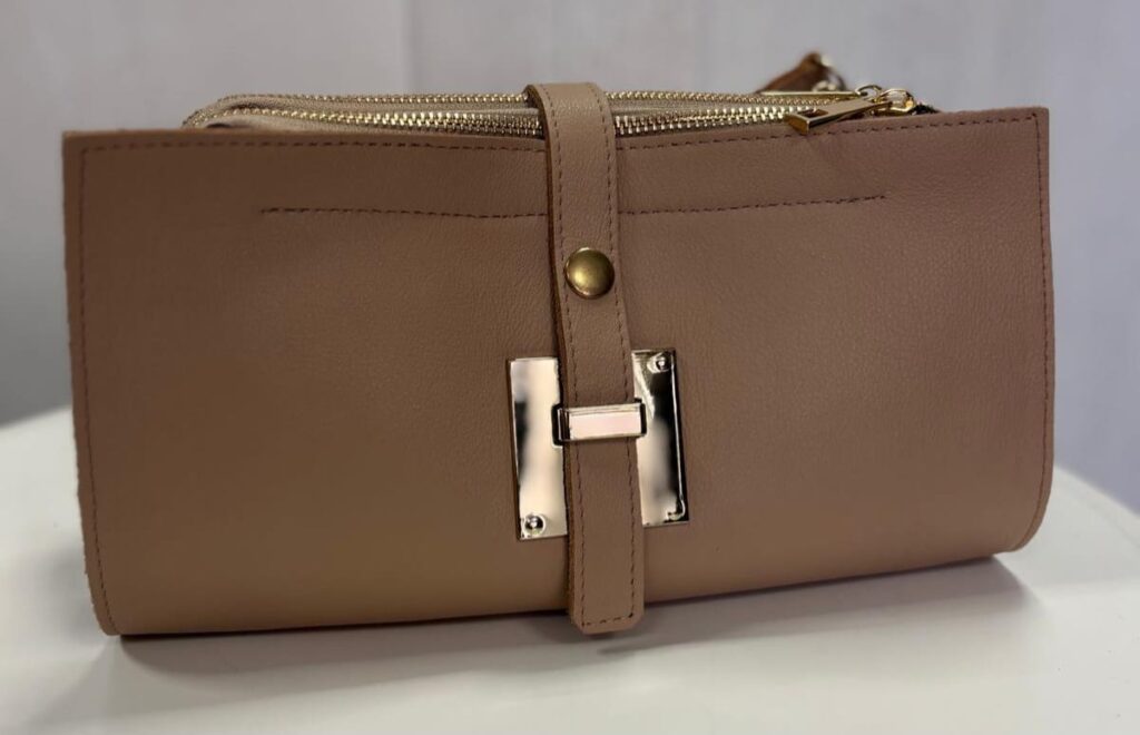 Stylowa i funkcjonalna torebka z naturalnej skóry o eleganckim, beżowym kolorze z subtelnym beżowym wykończeniem. Model „Elegant Trio” wyróżnia się trzema oddzielnymi komorami zapinanymi na złote zamki, co pozwala na idealną organizację codziennych drobiazgów. Wnętrze wyłożone jest gładką podszewką z dodatkowymi kieszonkami na drobiazgi. Torebka posiada odpinany, regulowany pasek na ramię, dzięki czemu można ją nosić zarówno w dłoni, jak i na skos.
