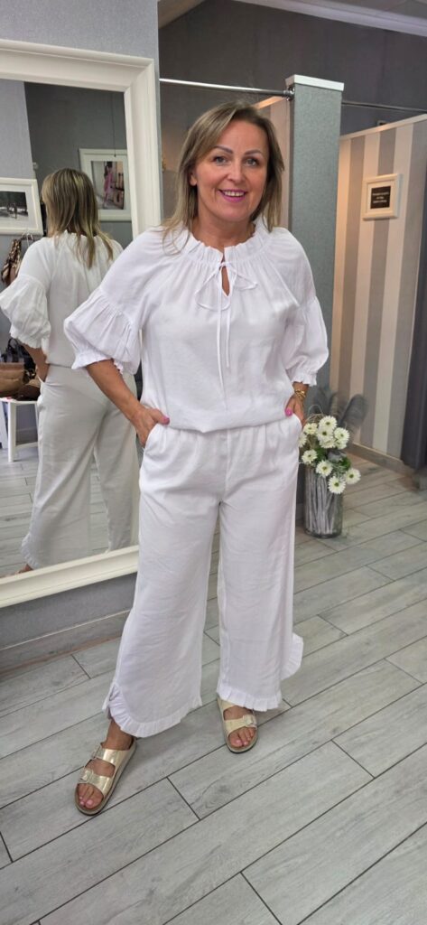 Do stworzenia pełnej stylizacji dostępne są również w sprzedaży spodnie zakończone falbanką, które doskonale dopełniają cały look, tworząc harmonijną i niezwykle kobiecą całość.