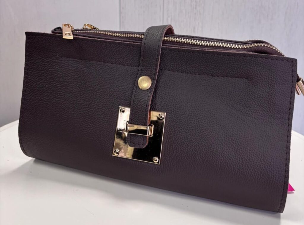 Stylowa i funkcjonalna torebka z naturalnej skóry o eleganckim, brązowym kolorze z subtelnym jasnobrązowym wykończeniem. Model „Elegant Trio” wyróżnia się trzema oddzielnymi komorami zapinanymi na złote zamki, co pozwala na idealną organizację codziennych drobiazgów. Wnętrze wyłożone jest gładką podszewką z dodatkowymi kieszonkami na drobiazgi. Torebka posiada odpinany, regulowany pasek na ramię, dzięki czemu można ją nosić zarówno w dłoni, jak i na skos.