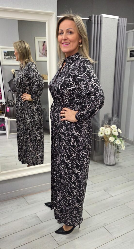 Sukienka, z długim rękawem. Uszyta z wysokogatunkowej, z cudownej w dotyku wiskozy. Materiał jest miękki, otulający, niezwykle komfortowy w noszeniu i wygląda elegancko. Dekolt wykończony stójką, zapinany na małe guziczki. Sukienka jest lekko przymarszczona pod biustem, gdzie można ją delikatnie związać przez co wysmukla oraz wyszczuplą sylwetkę.