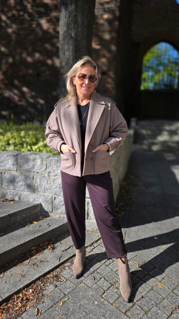 Elegancki klasyczny krótki płaszczyk dwurzędowy w jodełkę beżowy