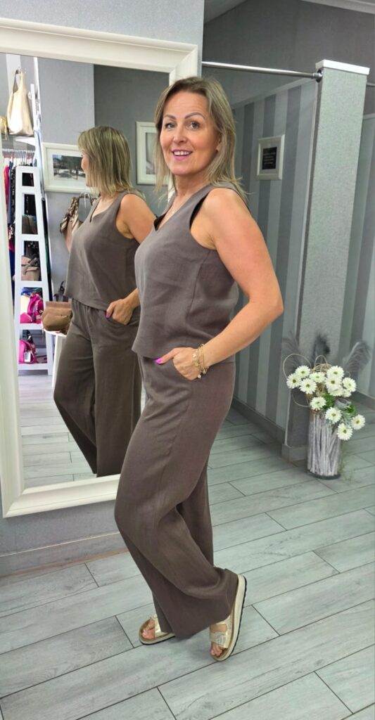 Lniany brązowy top na szerokich ramiączkach FEEMA