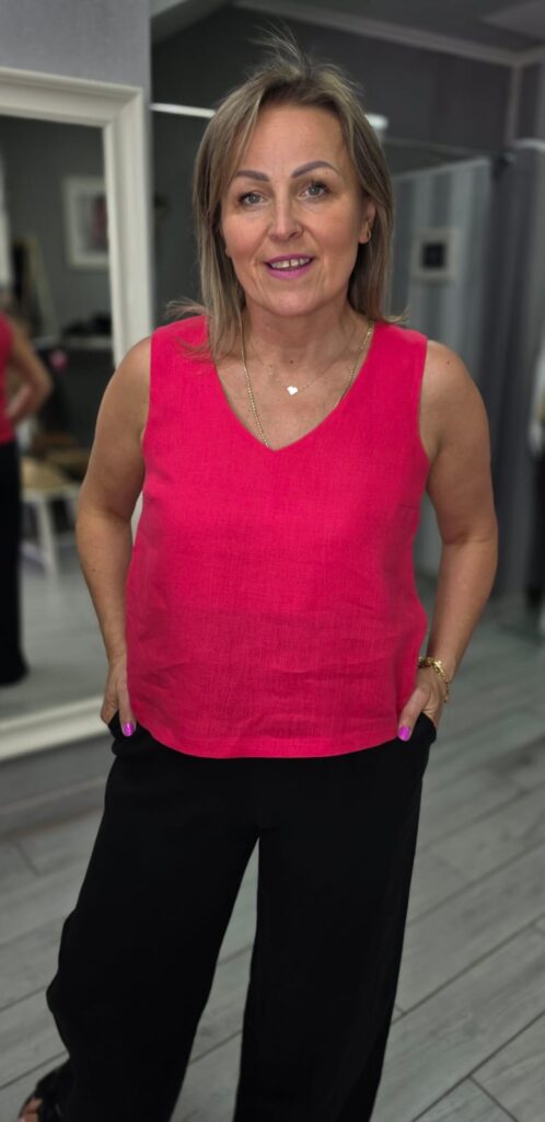 Lniany malinowy top na szerokich ramiączkach FEEMA