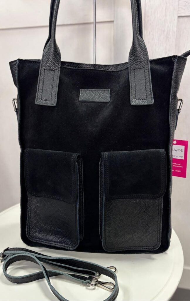 Piękna shopperka o niebanalnym i oryginalnym designie ,wykonana z włoskiej skóry zamszowej i naturalnej. Posiada bardzo obszerną komorę kryjącą i praktyczne kieszonki. Zawieszona na podwójnych komfortowych uchwytach ze skóry naturalnej. Dodatkowo jest pasek, który można dopiąć do torebki. Torba jest miękka a jej dno delikatnie usztywnione. Skóra odporna na zarysowania i obciążenia. Oryginalny fason, duża torba na ramię niezastąpiona na co dzień . Dzięki dwóm kieszonkom z przodu potrzebne przedmioty będą pod ręką. Doskonała propozycja do pracy i na uczelnie.