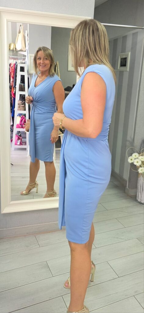 Sukienka Esqualo to sukienka o prostym fasonie bez rękawków z drapowanym detalem w talii. Dekolt w szpic, długość przed kolano, przepiękny odcień niebieskiego. Jeśli jest trochę chłodniej, a chcesz dopełnić swój wygląd połącz ją z krótką marynarką.