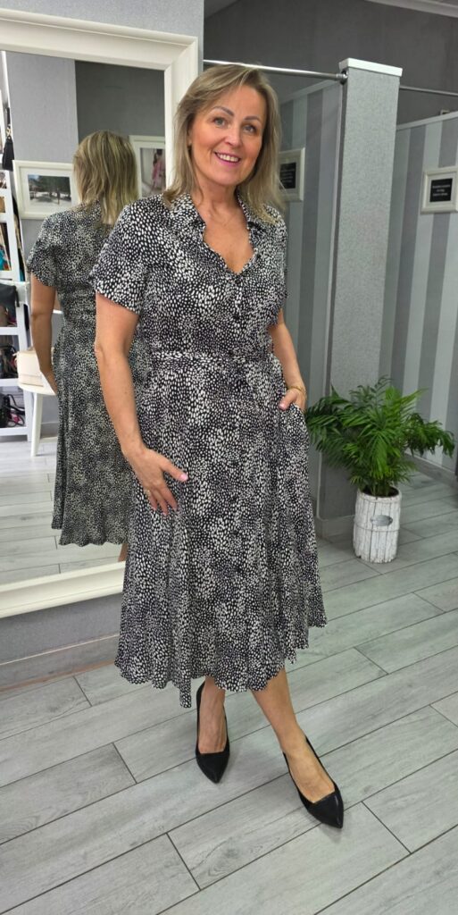 Piękna sukienka z cudownej w dotyku wiskozowej tkaniny. Sukienka typu szmizjerka z kołnierzykiem, taliowania w pasie. Zapinana na czarne ozdobne guziki, posiada dodatkowo piękny ozdobny pasek z tej samej tkaniny. Długość midi. Rękaw sukienki jest krótki. Sukienka ma kieszenie co nadaje sportowego charakteru.