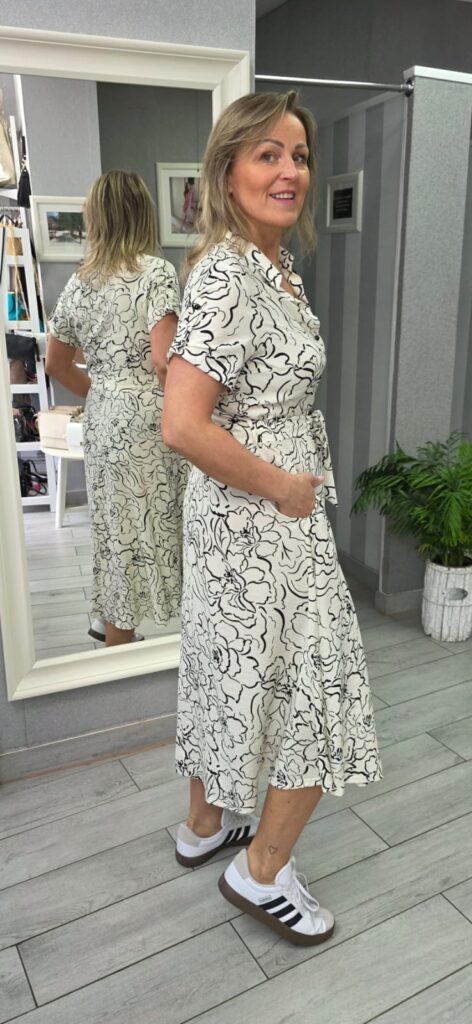 Piękna sukienka z cudownej w dotyku wiskozowej tkaniny. Sukienka typu szmizjerka z kołnierzykiem, taliowania w pasie. Zapinana na czarne ozdobne guziki, posiada dodatkowo piękny ozdobny pasek z tej samej tkaniny. Długość midi. Rękaw sukienki jest krótki. Sukienka ma kieszenie co nadaje sportowego charakteru.