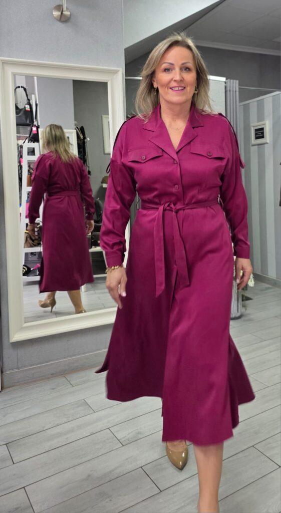 Piękna sukienka z cudownej w dotyku wiskozowej tkaniny. Sukienka typu szmizjerka z kołnierzykiem, taliowania w pasie. Zapinana na guziki, posiada dodatkowo ozdobny pasek . Długość midi. Rękaw sukienki długi, zapinany na guzik. Sukienka ma kieszenie co nadaje sportowego charakteru. Łączy siłę i subtelność – klasyczna szmizjerka w nowoczesnym wydaniu. Guziki, kieszonki i pasek w talii pięknie podkreślają sylwetkę, a prosty krój daje pełną swobodę stylizacji. Materiał jest miękki, otulający i niezwykle komfortowy w noszeniu. To sprawia, że TORI świetnie odnajduje się w chłodniejsze dni – wygląda elegancko, a jednocześnie daje przyjemne ciepło.