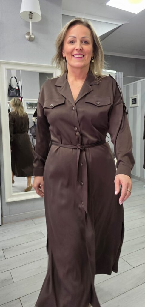Piękna sukienka z cudownej w dotyku wiskozowej tkaniny. Sukienka typu szmizjerka z kołnierzykiem, taliowania w pasie. Zapinana na guziki, posiada dodatkowo ozdobny pasek . Długość midi. Rękaw sukienki długi, zapinany na guzik. Sukienka ma kieszenie co nadaje sportowego charakteru. Łączy siłę i subtelność – klasyczna szmizjerka w nowoczesnym wydaniu. Guziki, kieszonki i pasek w talii pięknie podkreślają sylwetkę, a prosty krój daje pełną swobodę stylizacji. Materiał jest miękki, otulający i niezwykle komfortowy w noszeniu. To sprawia, że TORI świetnie odnajduje się w chłodniejsze dni – wygląda elegancko, a jednocześnie daje przyjemne ciepło.