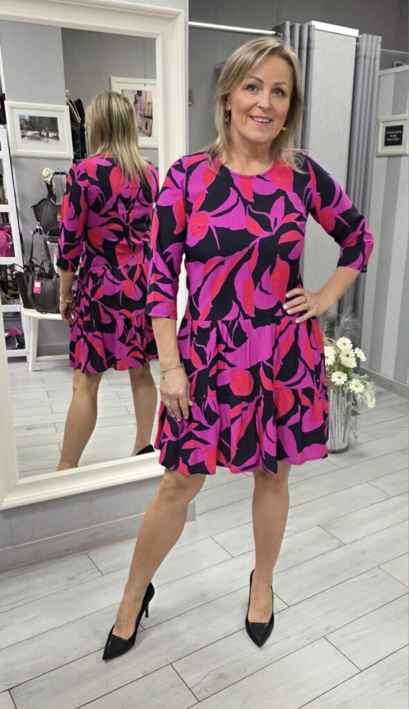Piękna trapezowa sukienka w wyjątkowej kolorystyce, która rozświetla i odmładza. Sukienka uszyta z miękkiej i delikatnej wiskozy. Z pół okrągłym dekoltem, wykończonym pod szyją. Rękaw o długości 3/4, bez dodatkowych zdobień. Długość przed kolano. Sukienka jest bardzo kobieca i uniwersalna, będzie pasować na różne sylwetki. Sukienka posiada kieszenie.