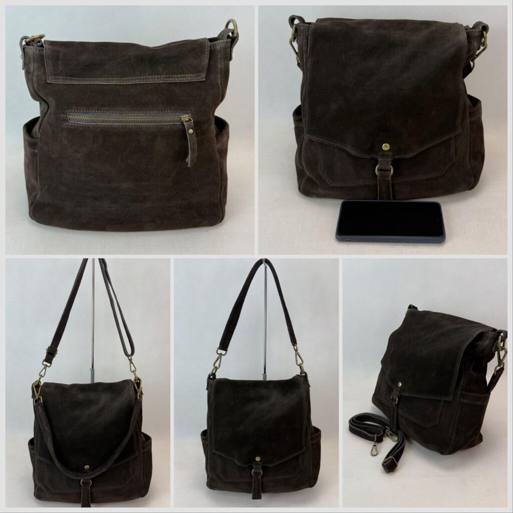 ZAMSZOWA TOREBKA ZE SKÓRY DUŻA LISTONOSZKA Z KLAPKĄ CZEKOLADOWA
