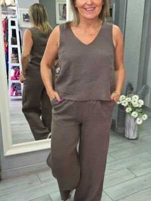 Lniany brązowy top na szerokich ramiączkach FEEMA